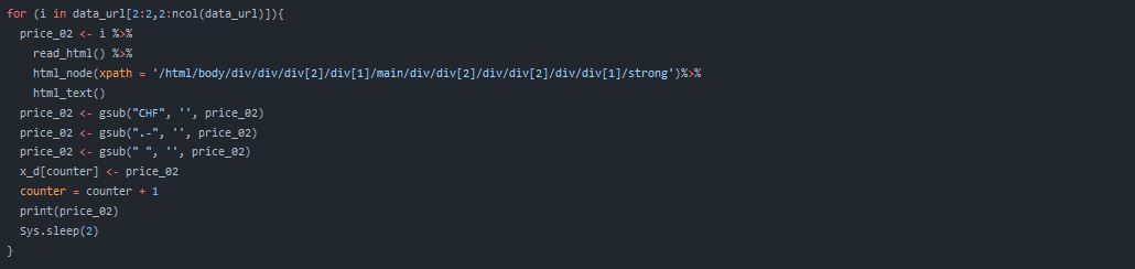 For this project I crawled 10 different product prices from 4 different Swiss online-stores. Data was crawled from the 25.11.2020 to the 14.12.2020. The R code can be found here: Crawler.R on Github.