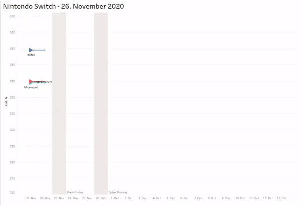 This GIF shows data for a Nintendo Switch for the observed online-shops. The blue arrow represents the data for Brack.ch, which did not have any changes in the price. The orange arrow represents digitec.ch, which changed 4 times. The red arrow represents Interdiscount, which changed once. The green arrow represents microsport, which changes multiple times. The chart was created with Tableau Desktop and was animated as a GIF.